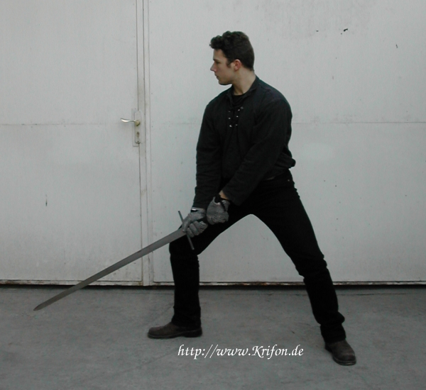 "stehe mit dem Lincken fuß vor / halt dein Schwerdt mit dem ort vor dir außgestreckt auff die Erden / fur deinen vorgesezten fuß / das die kurtze schneid oben / die Lange unden stehe"